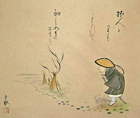“Sabi is in the colour of a poem. It does not necessarily refer to the poem that describes a lonely scene. If a man goes to war wearing a stout armour or to a party dressed up in gay clothes, and if this man happens to be an old man, there is something lonely about him. Sabi is something like that. It is in the poem regardless of the scene it describes – whether it is lonely or gay. In the following poem, for example, I find a great deal of sabi.” *