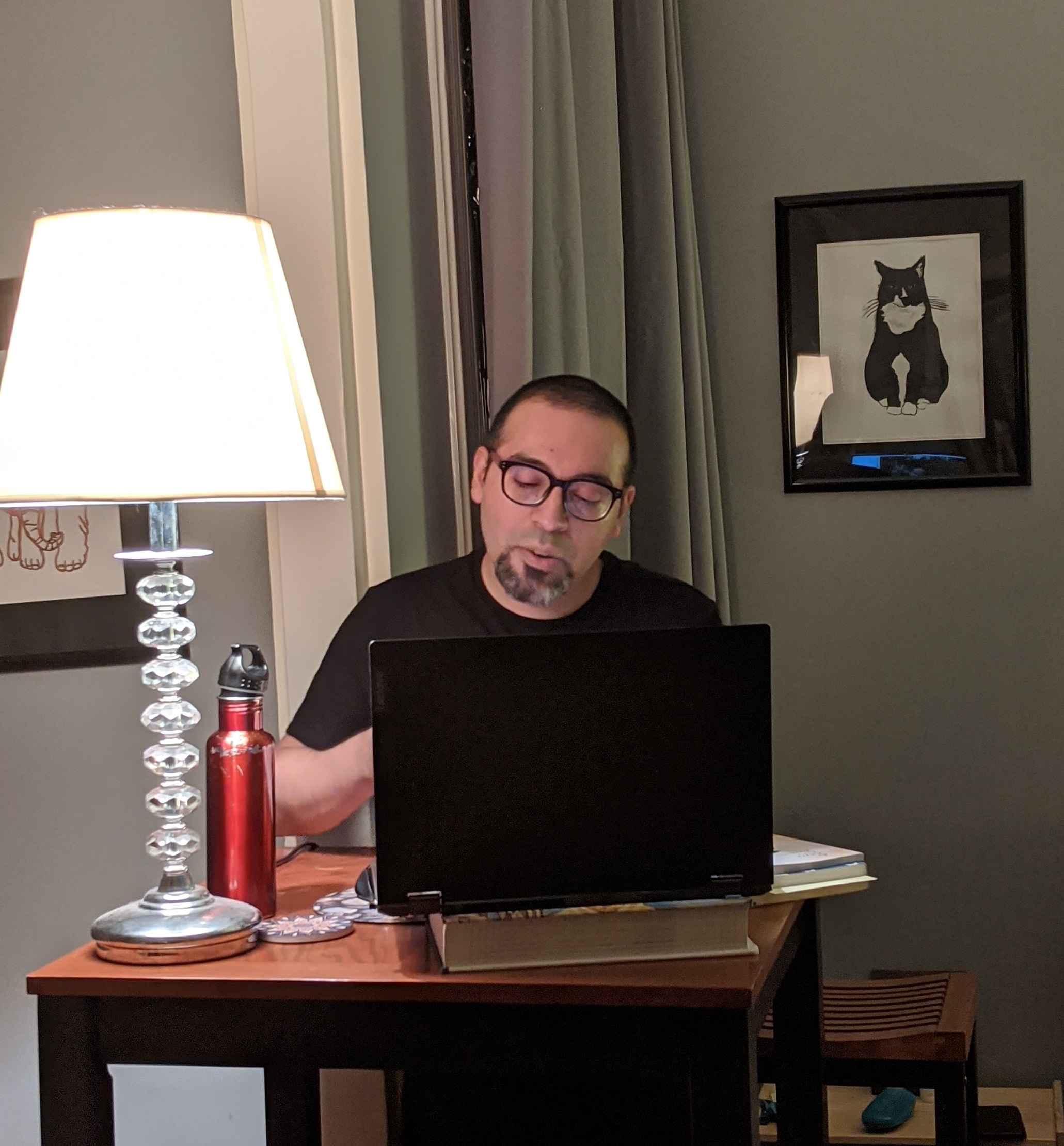 A brown man standing before a laptop reading poetry.