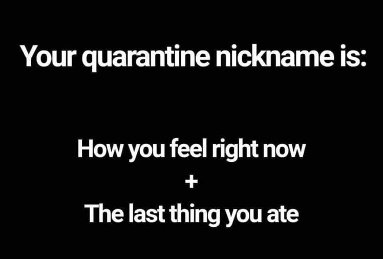 Image description: A black square with the following written in white letters: “Your quarantine nickname is: How you feel right now + The last thing you ate”
