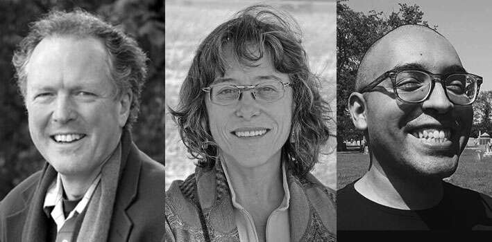 A photograph of poets Kim Stafford, Elizabeth Dodd, and José Angel Araguz.