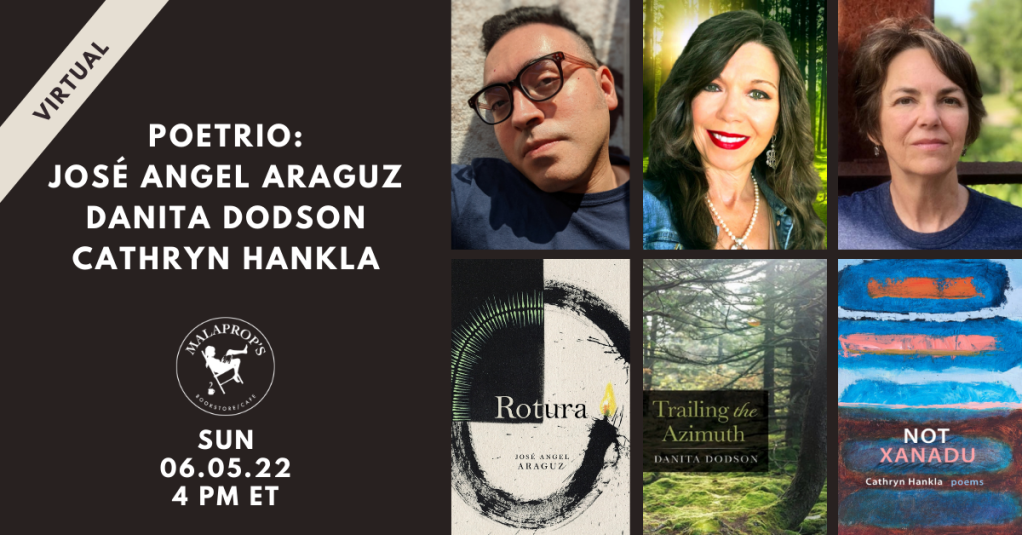 WHAT: Malaprop’s Virtual POETRIO poetry event featuring José Angel Araguz, Danita Dodson, and Cathryn Hankla