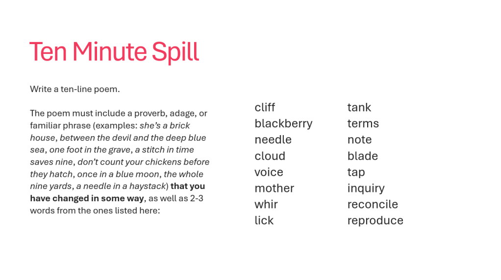 Guidelines: Write a ten-line poem. The poem must include a proverb, adage, or familiar phrase (examples: she’s a brick house, between the devil and the deep blue sea, one foot in the grave, a stitch in time saves nine, don’t count your chickens before they hatch, once in a blue moon, the whole nine yards, a needle in a haystack) that you have changed in some way, as well as 2-3 words from the ones listed here: cliff, blackberry, needle, cloud, voice, mother, whir, lick, tank, terms, note, blade, tap, inquiry, reconcile, reproduce.