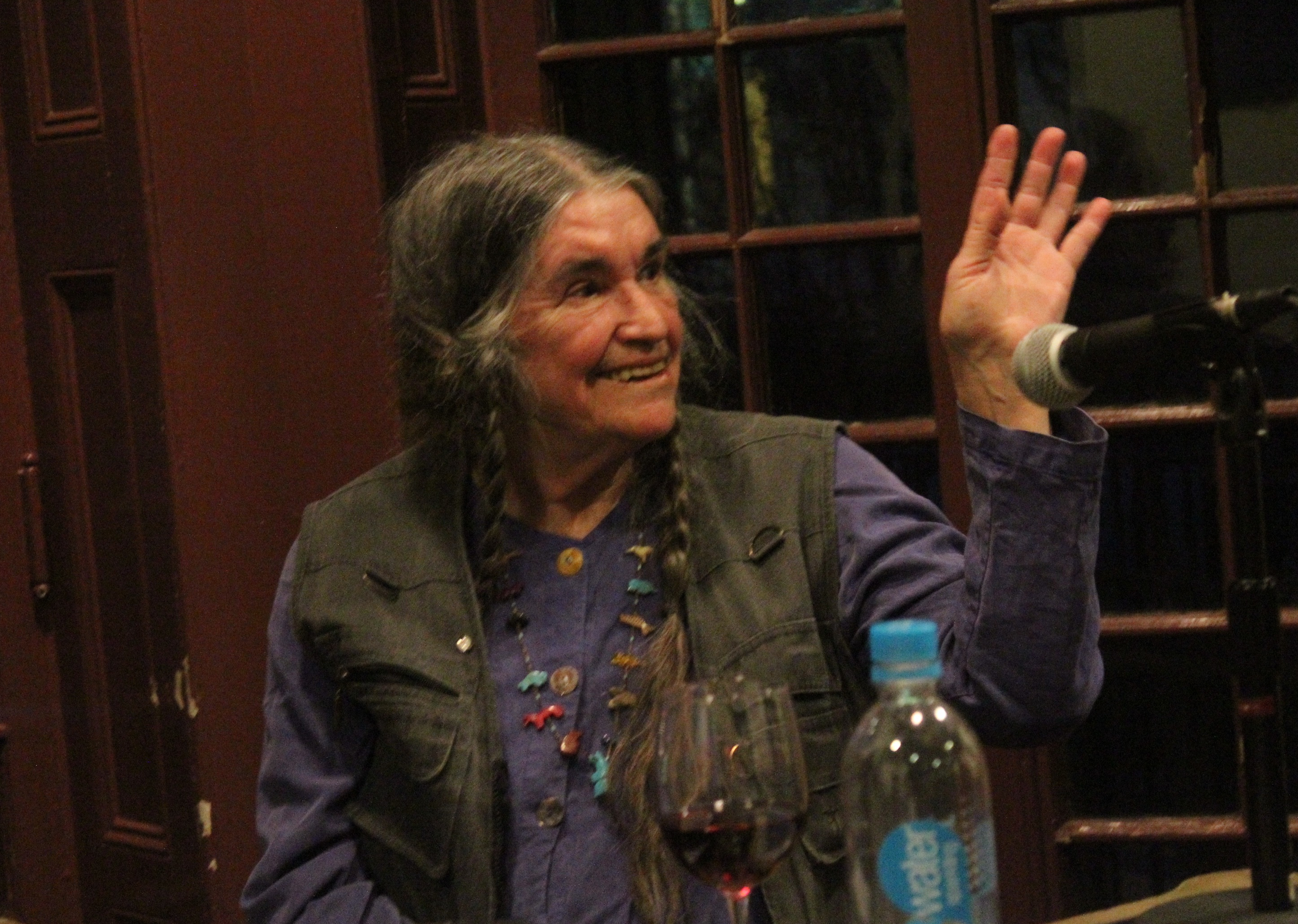 Bernadette Mayer sitting and waving before a microphone with a glass of wine and a water bottle.