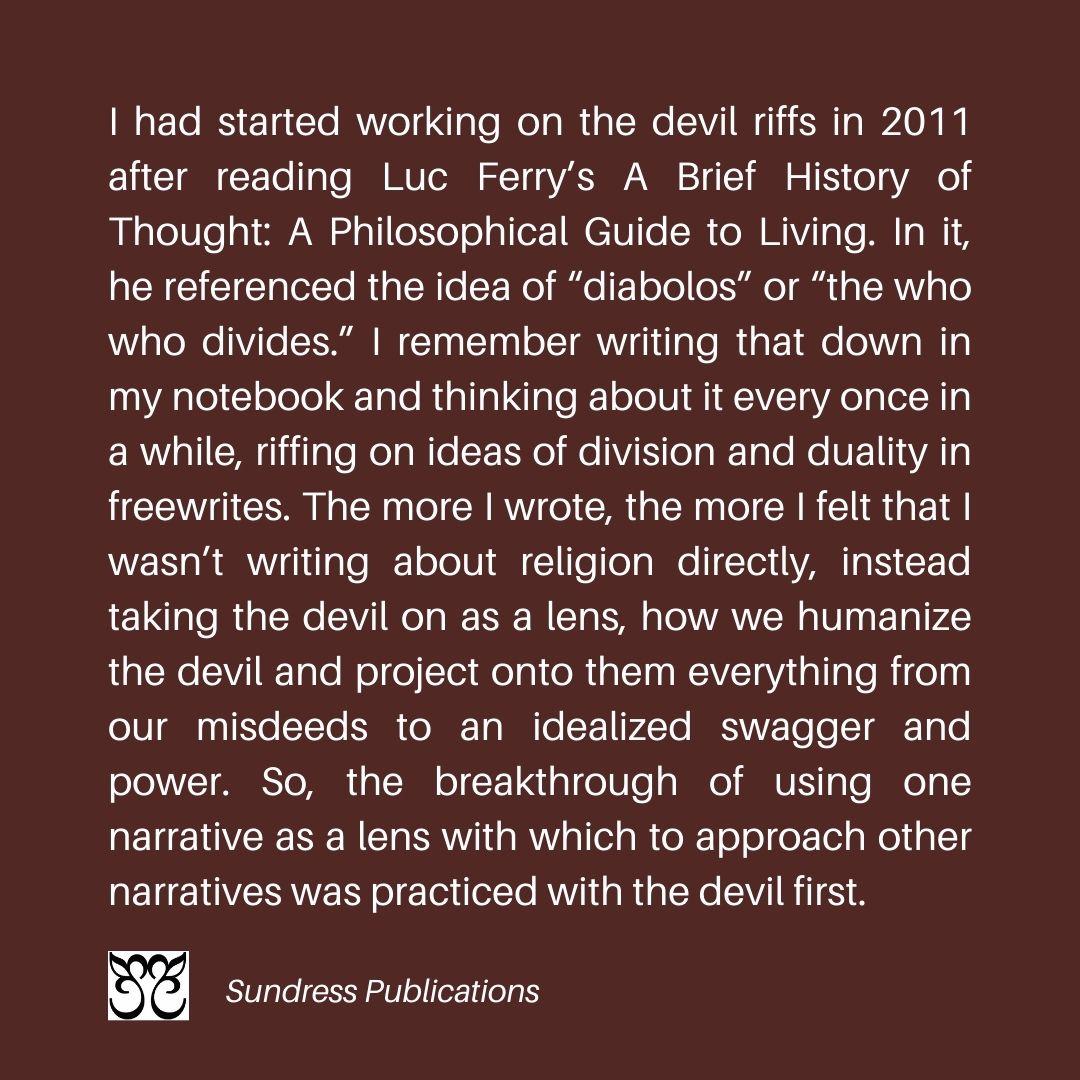 José: I had started working on the devil riffs in 2011 after reading Luc Ferry’s A Brief History of Thought: A Philosophical Guide to Living. In it, he referenced the idea of “diabolos” or “the who who divides.” I remember writing that down in my notebook and thinking about it every once in a while, riffing on ideas of division and duality in freewrites. The more I wrote, the more I felt that I wasn’t writing about religion directly, instead taking the devil on as a lens, how we humanize the devil and project onto them everything from our misdeeds to an idealized swagger and power. So, the breakthrough of using one narrative as a lens with which to approach other narratives was practiced with the devil first.