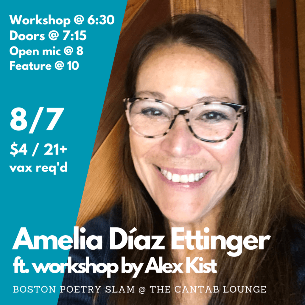 WHAT: Boston Poetry Slam @ The Cantab Lounge hosts Amelia Díaz Ettinger WHEN: Wednesday, August 7th: workshop at 6:30PM; open mic at 8PM; feature at 10PM (all times EST) WHO: Amelia Díaz Ettinger WHERE: 738 Massachusetts Avenue, Central Square, Cambridge [directions]