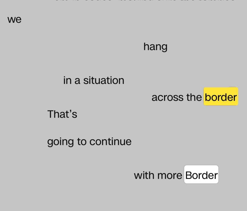 An erasure that reads: we hang in a situation across the border that’s going to continue with more border.An erasure that reads: Trump? what he knows Look, border border border.