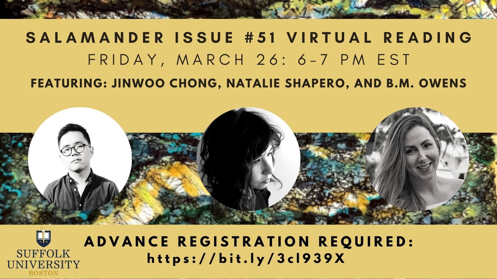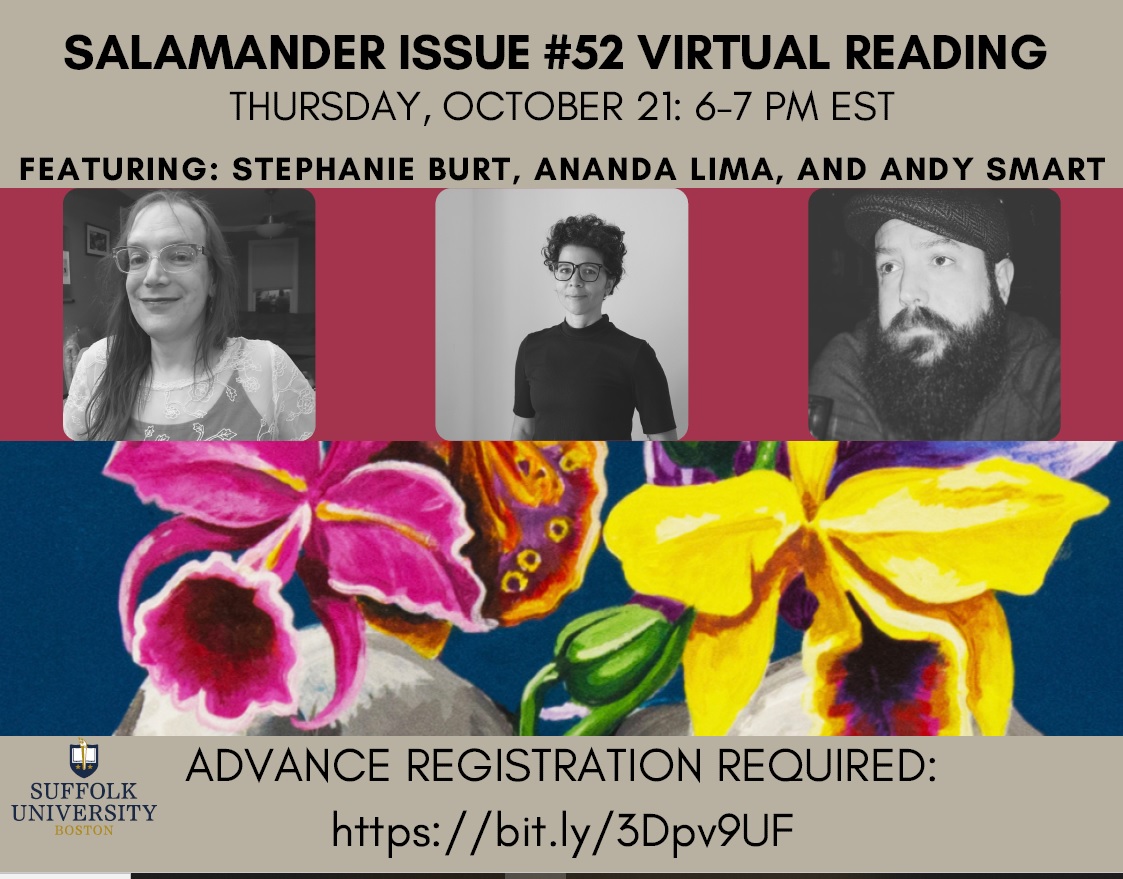 Just a quick post to share that Salamander is hosting a virtual reading on Thursday, October 21st from 6-7 PM EST, featuring readings from three contributors from Issue #52: Andy Smart, Stephanie Burt, and Ananda Lima.
